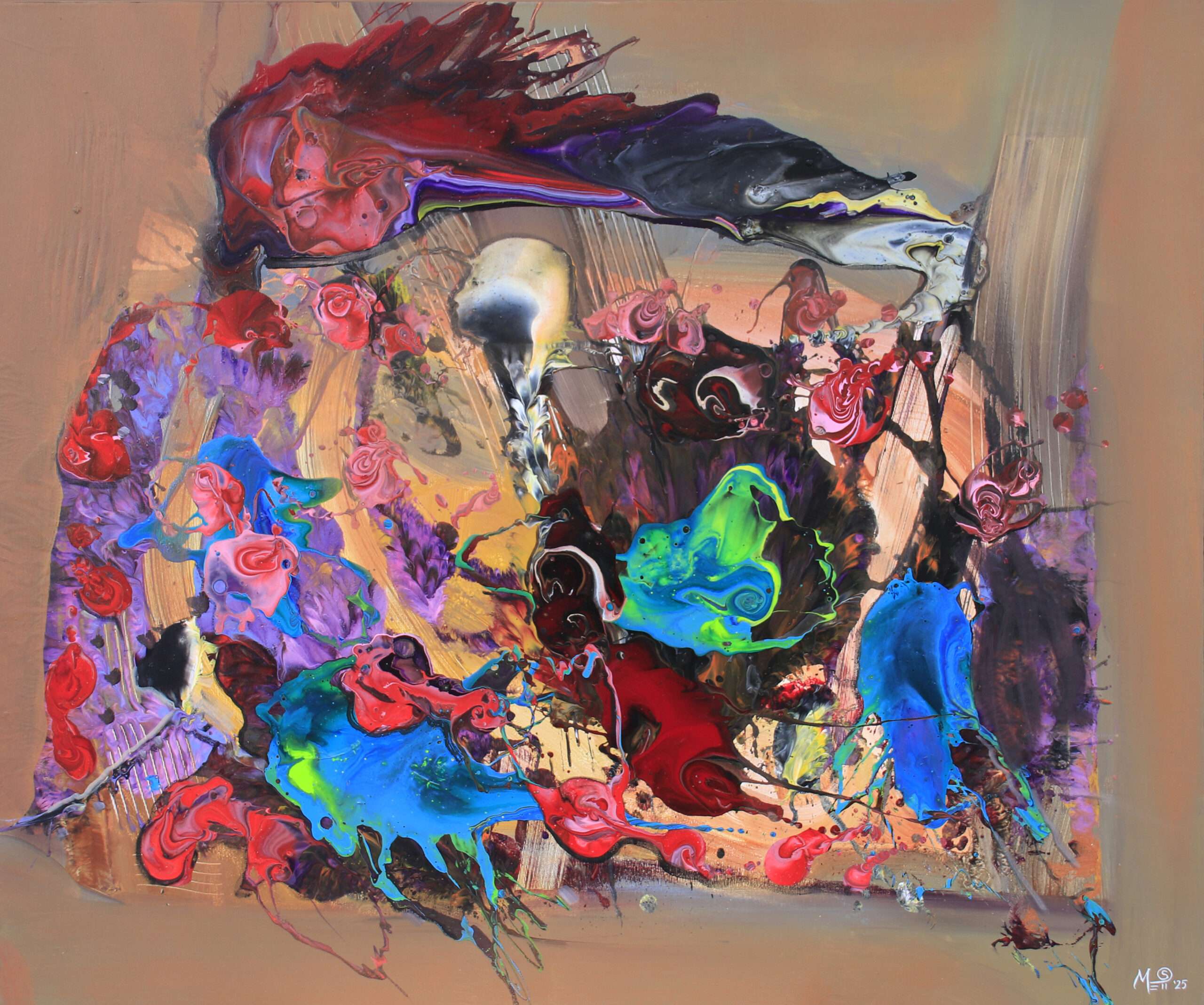 This painting by Metis is an explosion of color and emotion, where abstract shapes and dynamic flows create a sense of freedom and energy. The contrast between the bright tones and the soft background gives the work depth and mystery, inviting the viewer to discover personal stories within the poetic chaos of color.